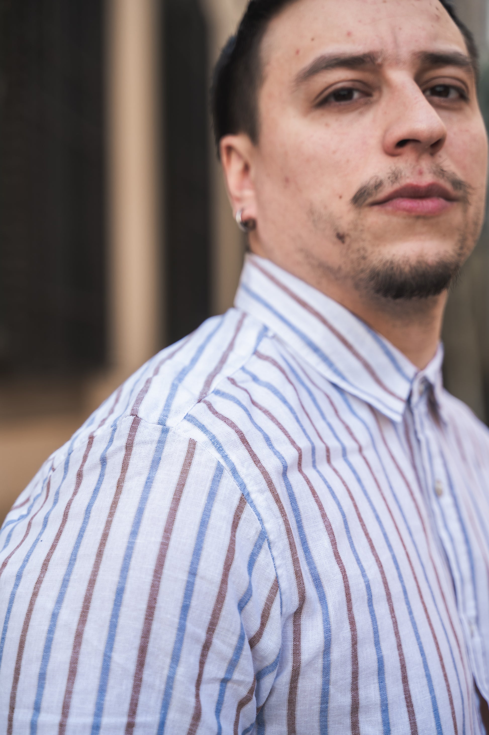 Camicia con fantasia a righe realizzata in tessuto misto lino (Lino55% Cotone45%)
