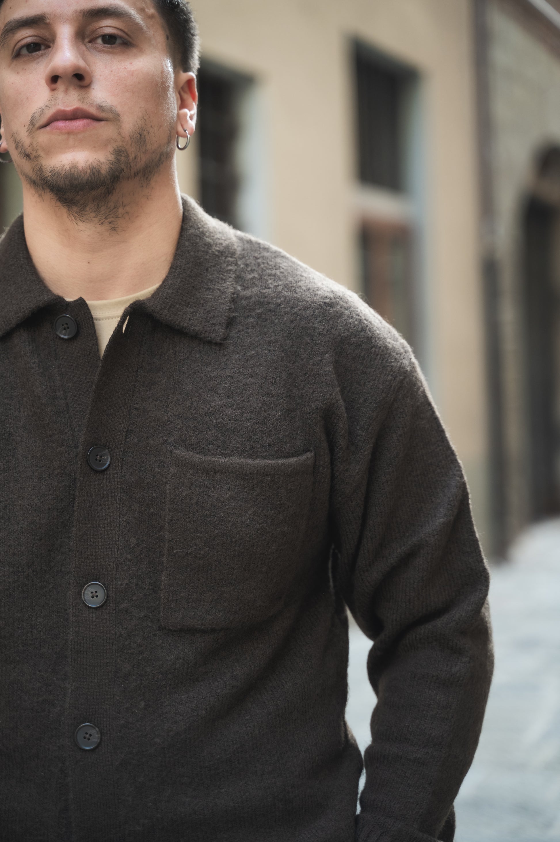 Cardigan in morbido panno con tasca sul petto e collo camicia.