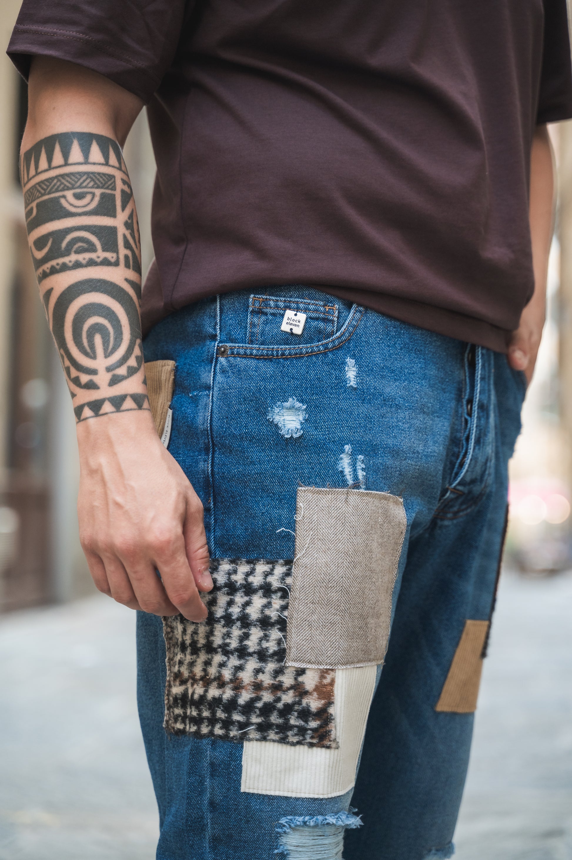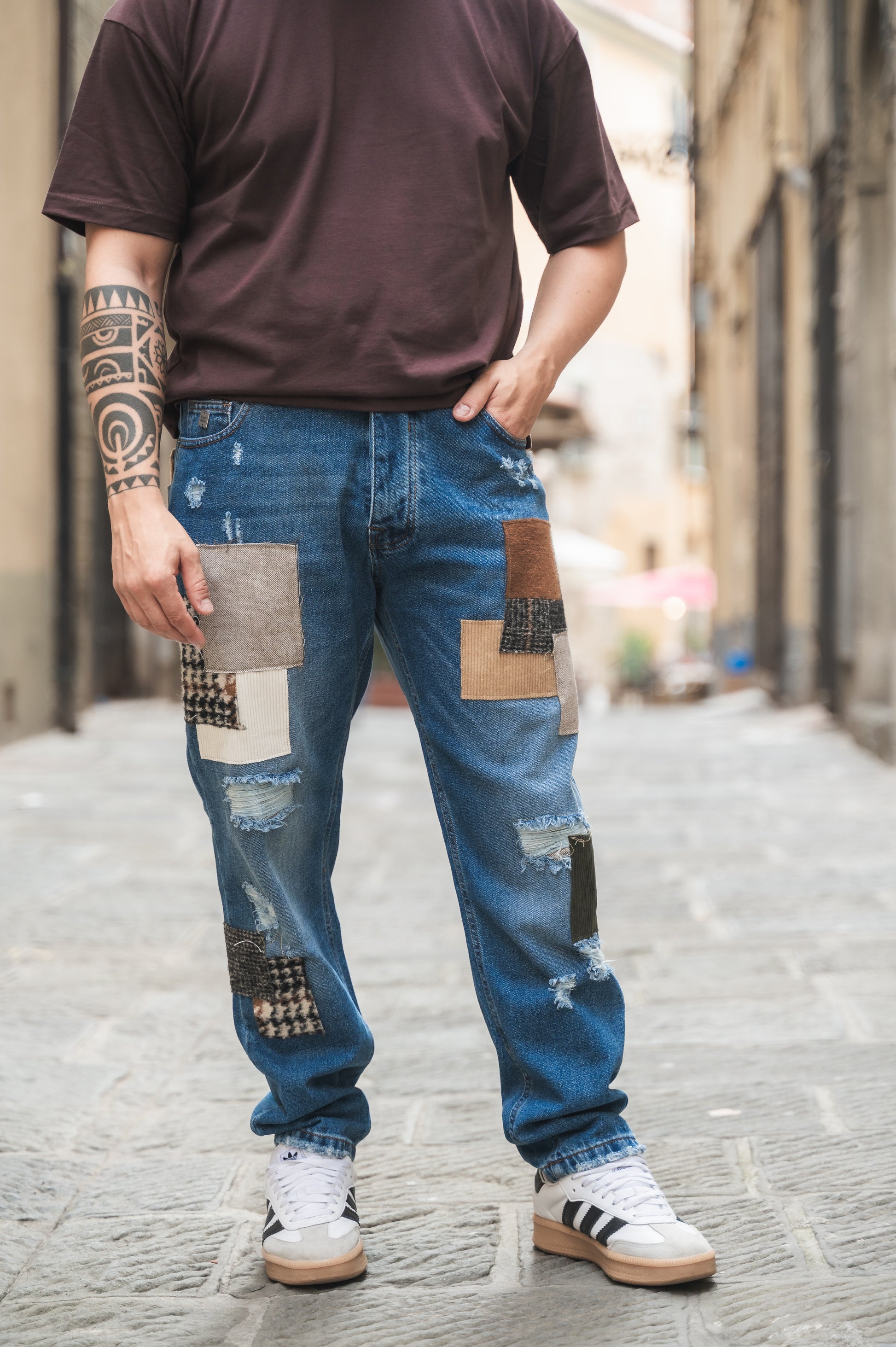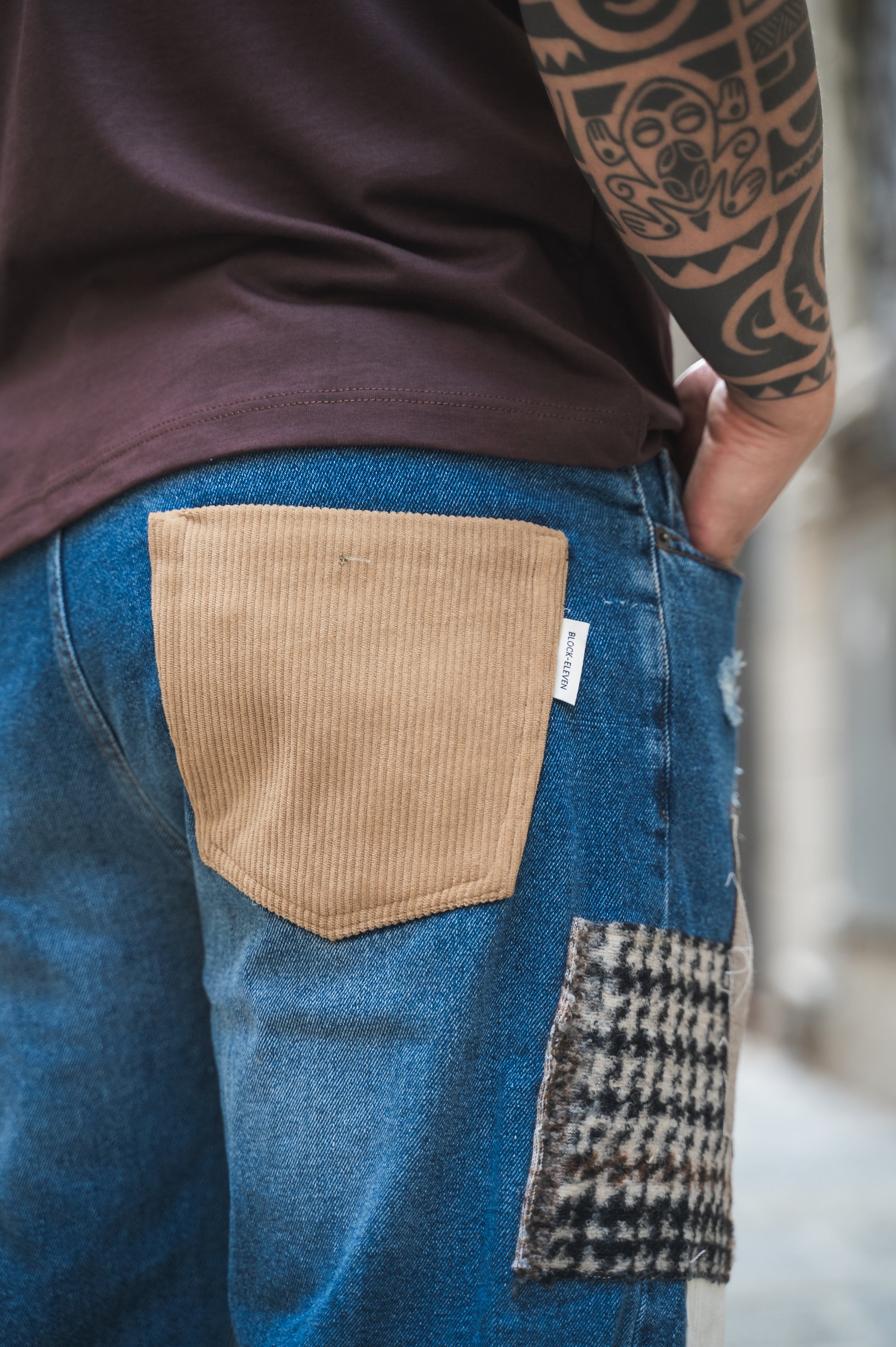 Jeans con toppe in velluto e in panno fantasia ,modello leggermente Cropped