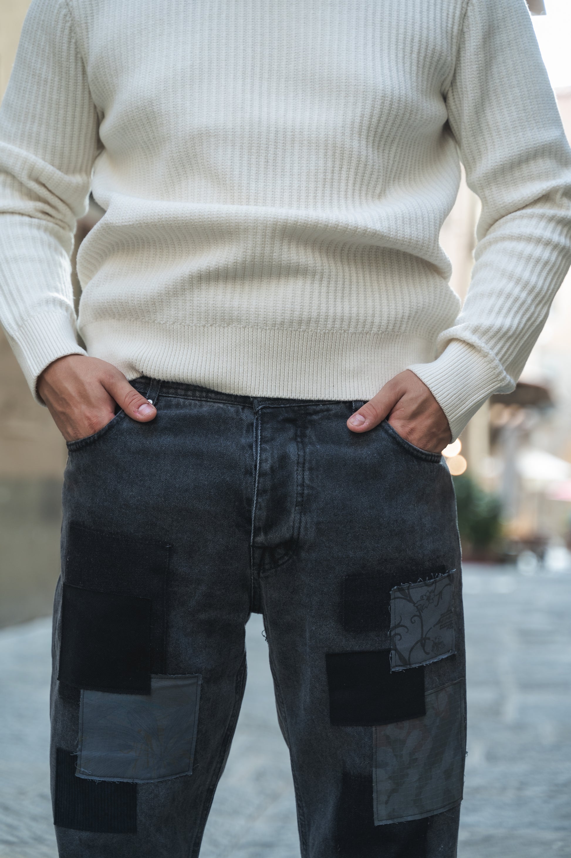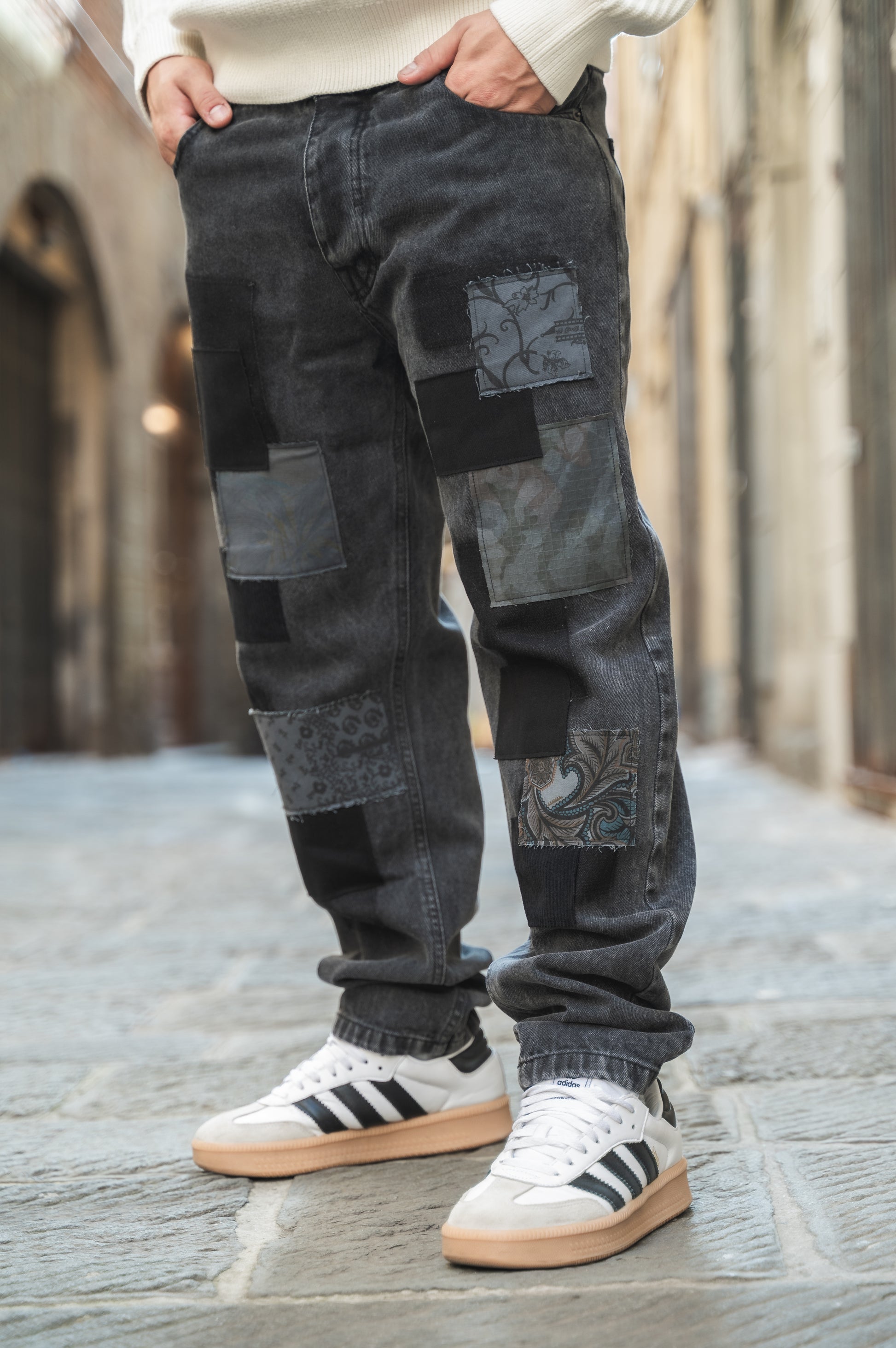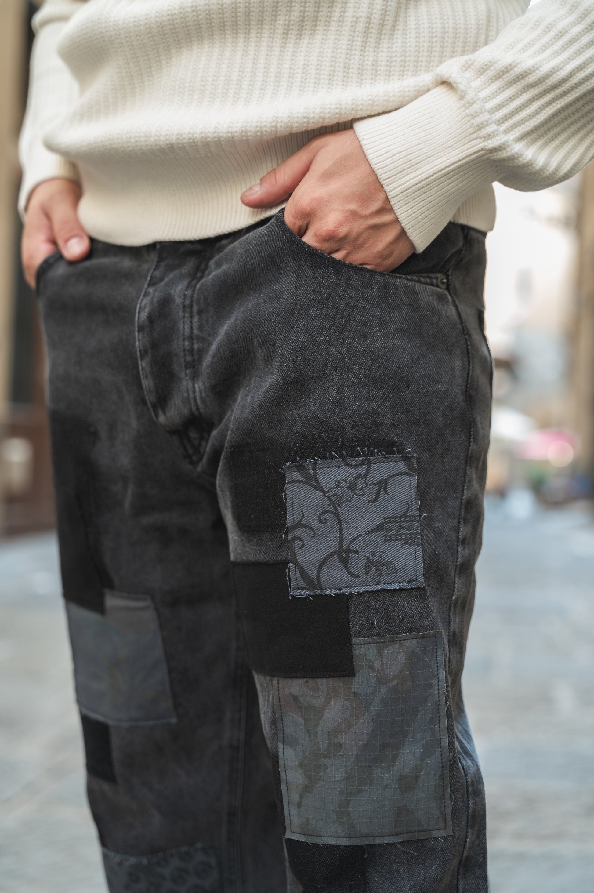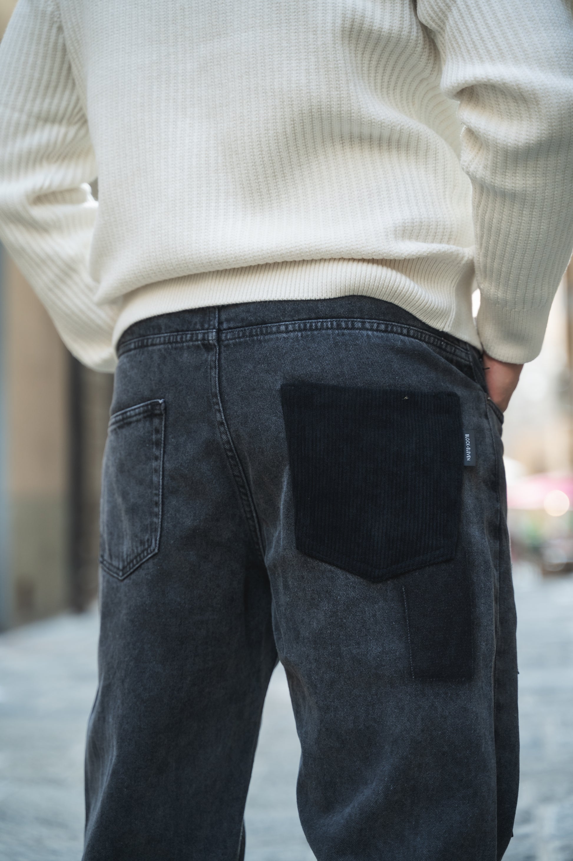 Jeans con toppe in velluto in velluto e in panno,modello leggermente Cropped nel colore nero