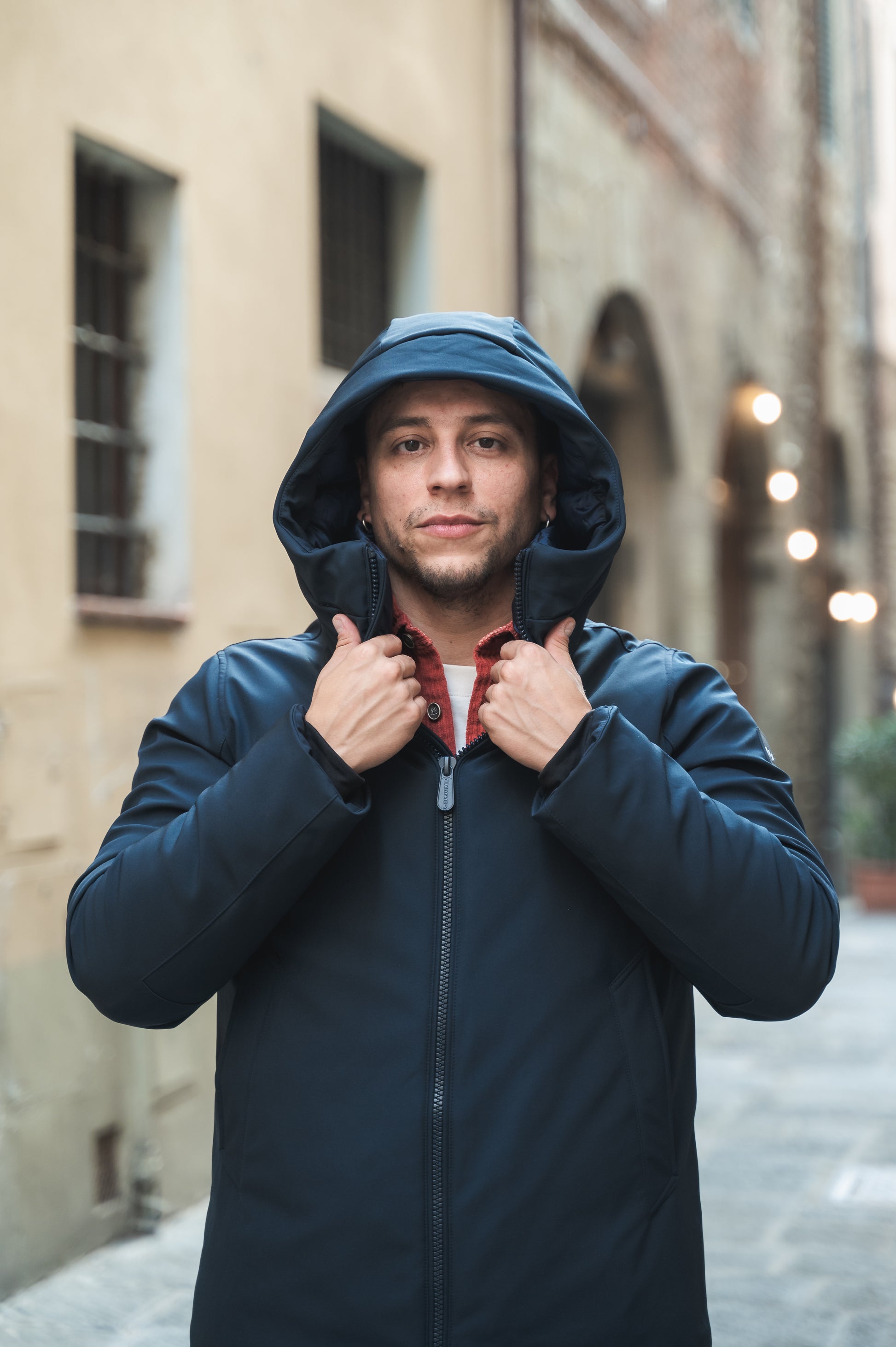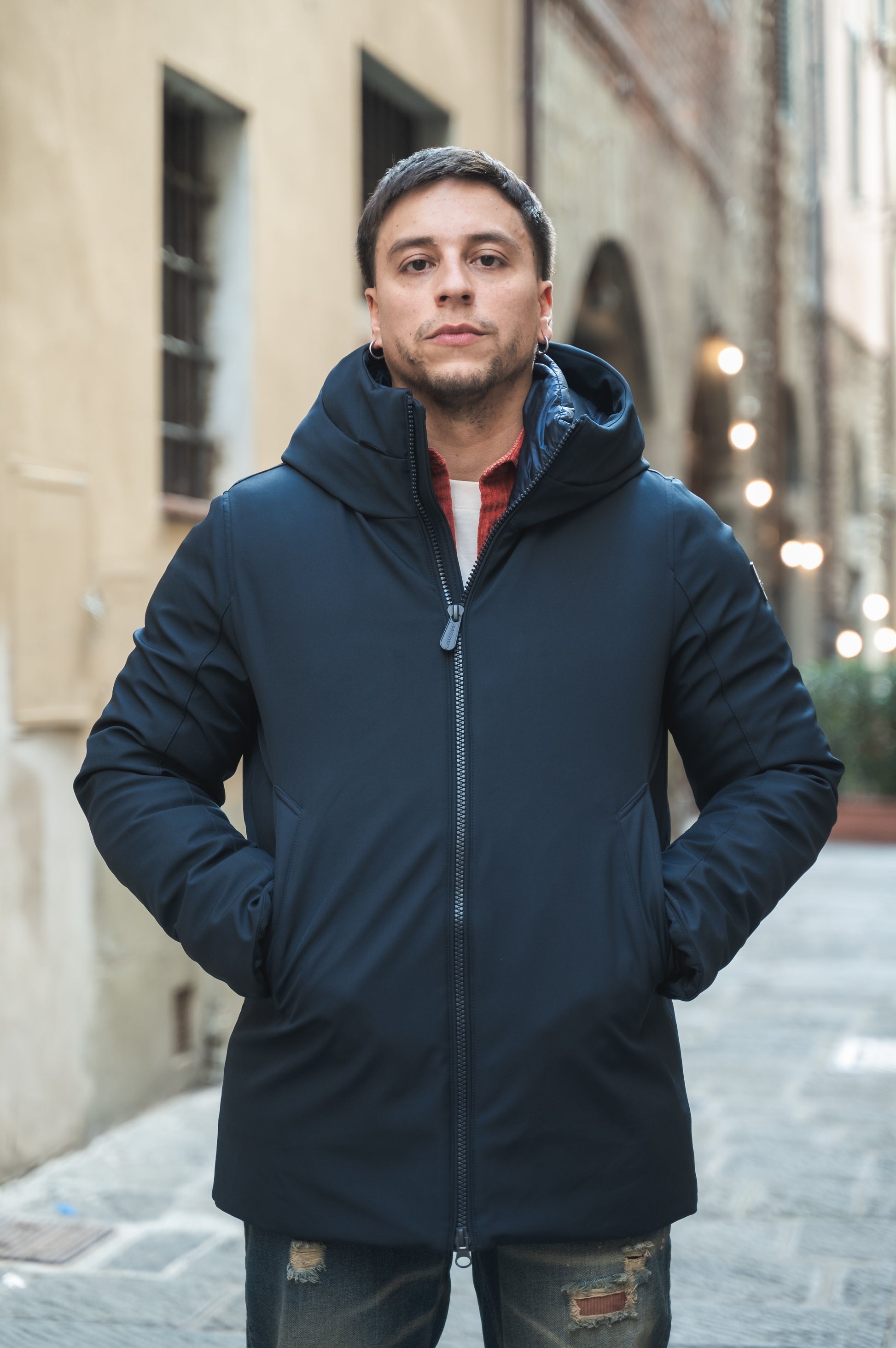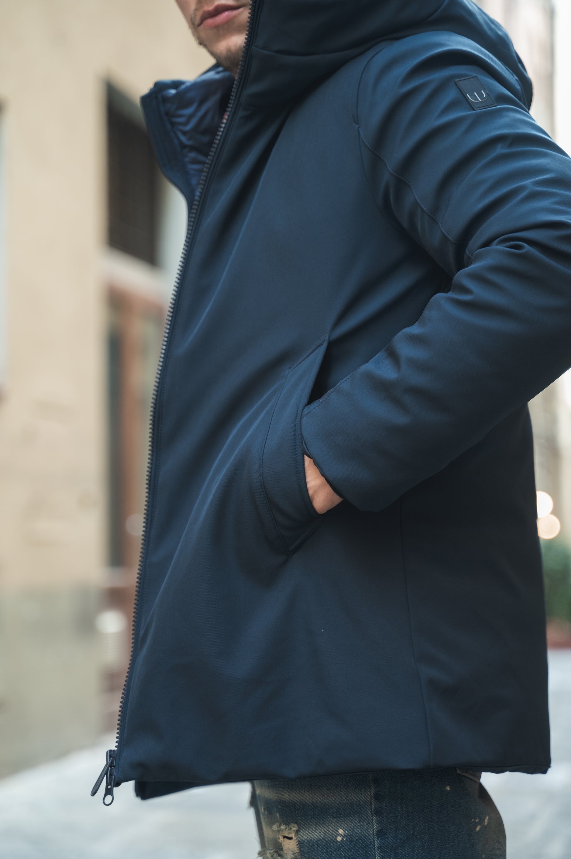 Trench imbottito con cappuccio,antivento con doppia chiusura sulla cerniera,tasche laterali e interne.