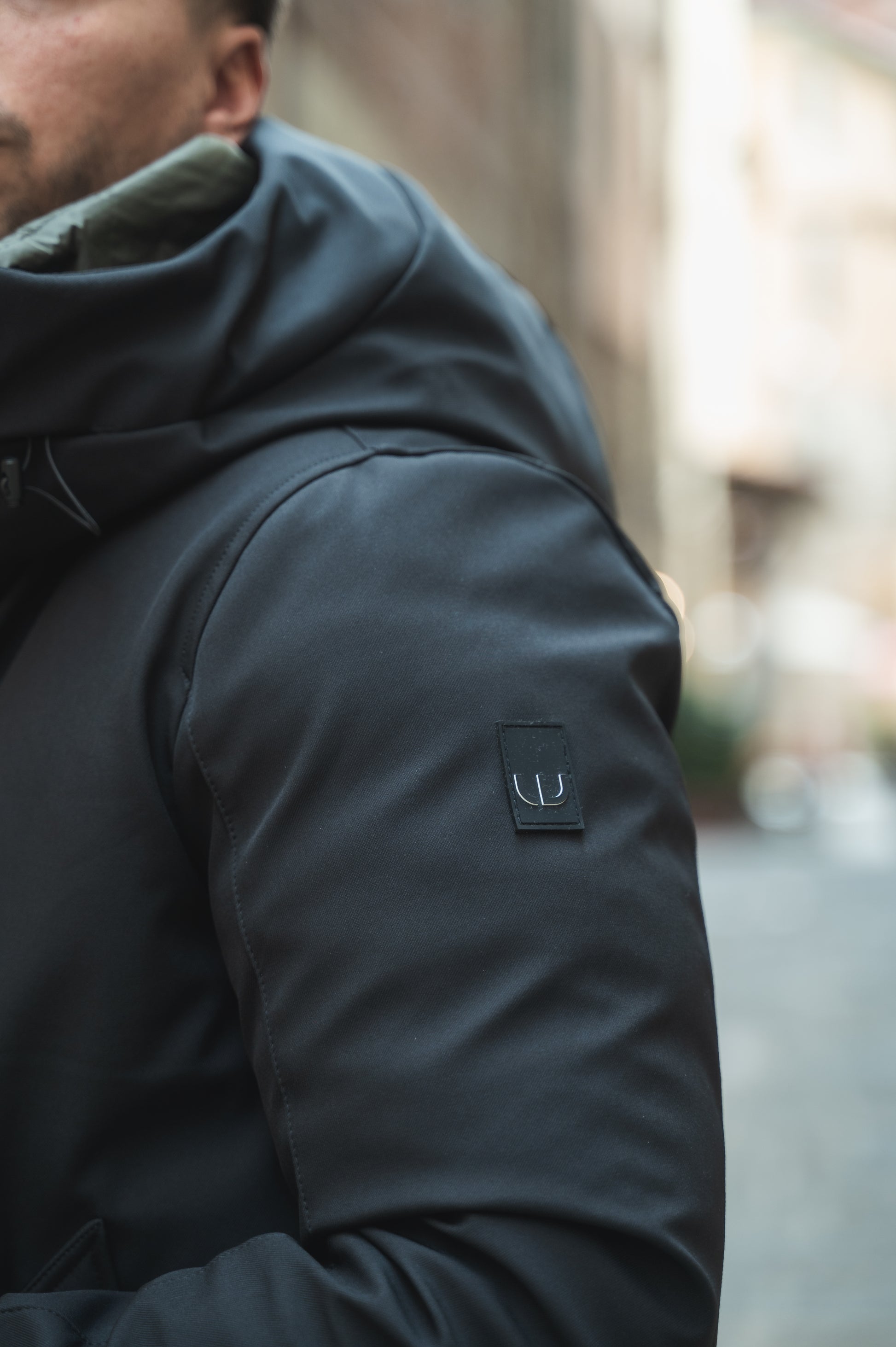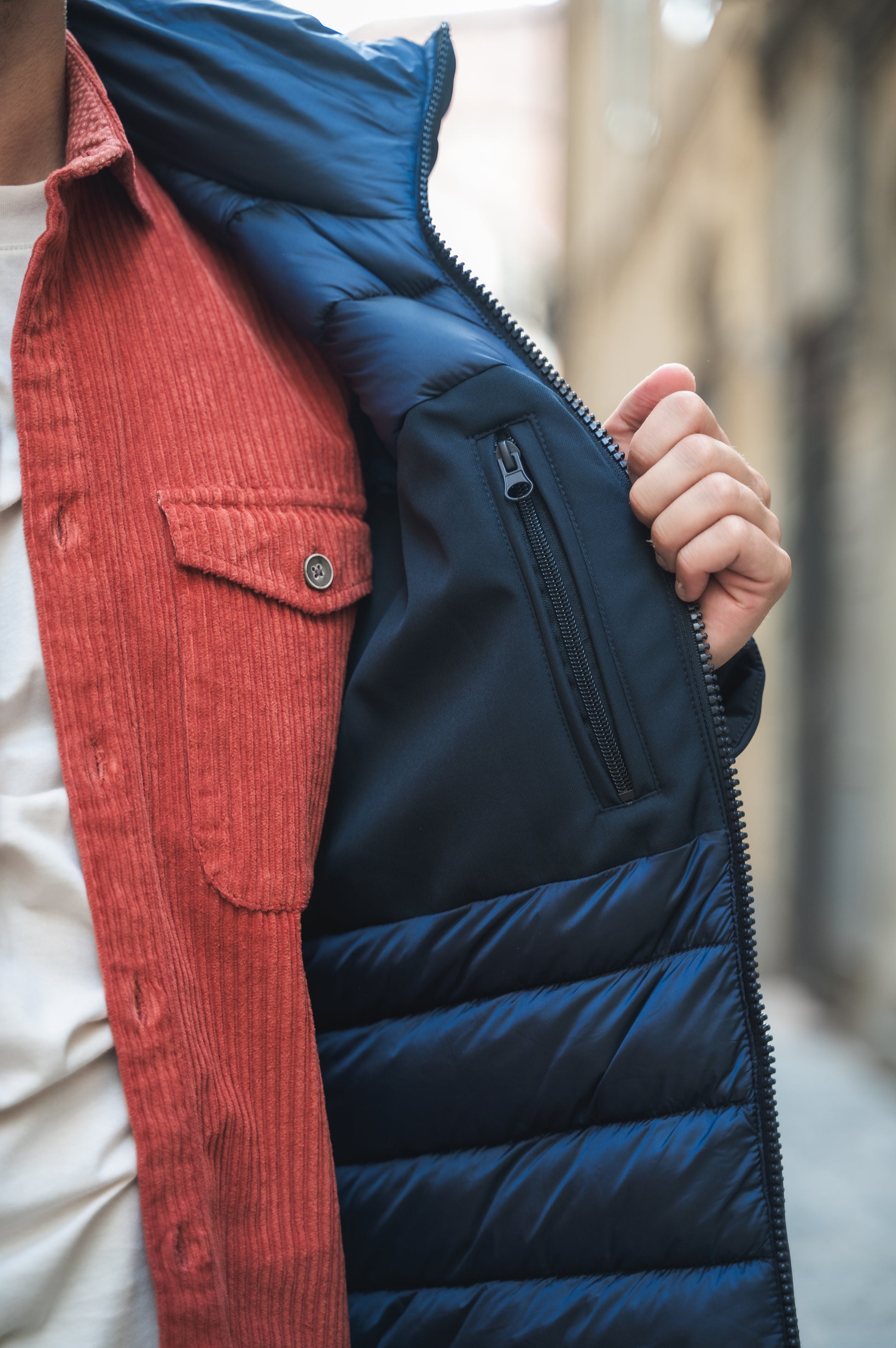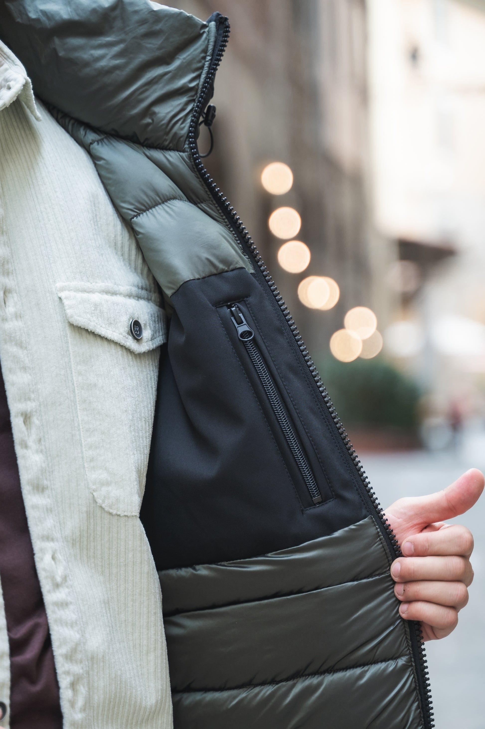 Trench imbottito con cappuccio,antivento con doppia chiusura sulla cerniera,tasche laterali e interne.